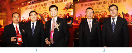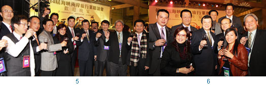 3.中國國家旅遊局紀檢組長劉金平、台灣觀光局副局長謝謂君、中國國家旅遊局長邵琪偉、台灣觀光局長賴瑟珍、中國國家旅遊局副局長杜江、台灣觀光局副局長劉喜臨在歡迎晚宴上,共同舉杯向來賓致意。