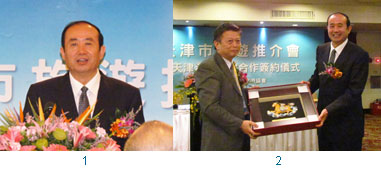 1.天津市旅遊協會會長佘清文。2.天津市旅遊協會會長佘清文(右)與中華兩岸旅行協會理事長許晉睿互換禮物。