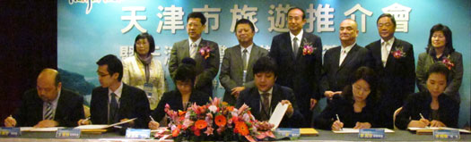 天津市旅遊協會由會長佘清文率領來台,於3╱1在台北舉辦天津旅遊推介會,並進行津台兩地旅遊業者的客源互送合作簽約儀式,共有天津康輝、天津市經典假期、天津中國青年旅行社和台方的東方、天河、澄清湖、百昱、台灣福安、君鵬、台灣星辰、台灣貴豪8家旅行社參與,同時邀請長榮、復興航空代表、台灣旅行協會、台灣觀光局等貴賓蒞臨見證。