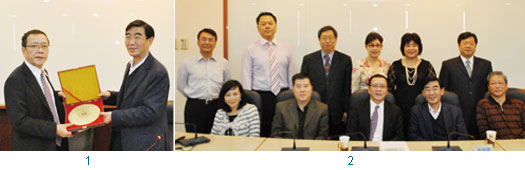 1.黃山市副市長暨黃山市中小企業服務機構聯合會名譽會長徐健敏(右)致贈黃山市非物質文化遺產羅盤予品保協會理事長曾盛海。2.品保協會理事長曾盛海(前排中)、黃山市副市長徐健敏(前排右2)與品保協會與會會員合影。