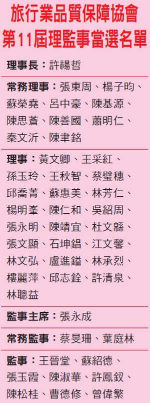 旅行業品質保障協會第11屆第1次會員大會於8/30假大直典華舉辦,現場會員本人出席超過1,500人,而當日也是第11屆理監事團隊的改選,雖然雙方候選人競爭激烈,但仍舊秉持著:「選舉是一時,朋友是一輩子」的理念,讓現場即使因選情而沸騰,仍舊保持友好與熱情,展現出旅遊業者的友善特性。而在最終,由天擎旅行社董事長許禓哲競選團隊拿下勝利,許禓哲出任第11屆品保協會理事長,監事主席則由雲品旅行社董事長張永成擔任。