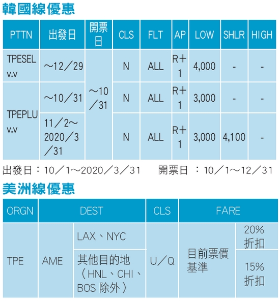 大韓航空已延長韓國線優惠促銷價格,同時推出美洲線優惠促銷價格,敬請多加利用!提醒您1B系統若價格內建TOURCODE(PV FARE),勿再下折扣,依照系統內建為主。若為公開票價(PB FARE)皆可依照KP規定拿折扣。新價格已於系統建置完成,產品上架前請確認訂位系統票規等資訊。
