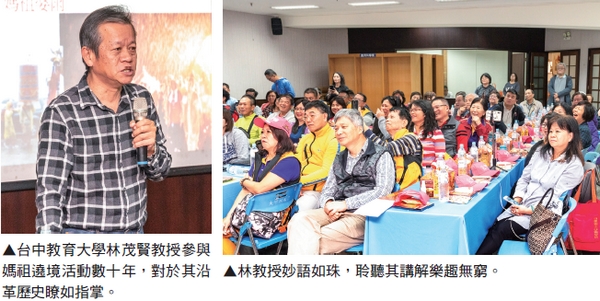 「媽祖文化歷史及發展現況」課程由台中教育大學林茂賢教授主講,林教授參與媽祖遶境活動數十年,對於台灣媽祖文化信仰浸淫甚深,簡報深入淺出,從媽祖信仰開始到遶境點滴娓娓道來,言談間妙語如珠令人捧腹,描述生動令人身歷其境,談到遶境種種信眾為重病家人殷切祈求媽祖施救的故事又令人萬分動容。