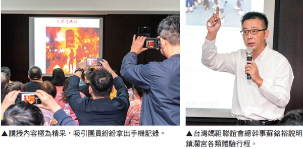 嗣後由台灣媽祖聯誼會總幹事蘇銘裕簡報鎮瀾宮各種套裝體驗行程,蘇總幹事為東南旅遊營業部副總經理,對於業內運作方式熟悉度自不在話下,本次以同業角度,特別針對操作方式做詳細說明,深獲團員讚許與認同,紛紛表示明年一定要組一個遶境考察團前來體驗。