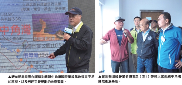 新北市市長侯友宜強調,中角灣國際衝浪基地成為北海岸青春山海線一個全新景點,有遊客中心與衝浪中心兩座全新硬體設備,結合觀光服務與水域運動推廣,為旅遊增加衝浪、立槳等運動體驗新元素。