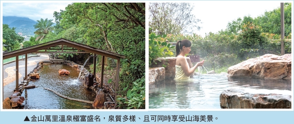 一趟美好的金山旅程,除了美食,還不能少的就是溫泉。金山萬里溫泉極富盛名,泉質多樣、且可同時享受山海美景,老街旁就有金包里公共浴室,溫泉旅館大多集中在台二線周邊,冬季正是安排一趟金山萬里溫泉之旅的最佳時機。