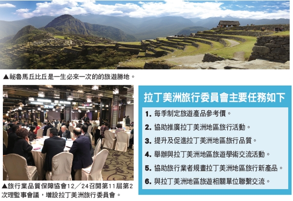 隨著台灣旅客前往南美旅客人數不斷增長,獲金質獎肯定的南美旅遊行程也不在話下,旅行業品質保障協會12╱24召開第11屆第2次理監事會議,會議中依章程第28條提案增設「拉丁美洲旅行委員會」並決議通過,理事長許禓哲並提名永嘉旅行社總經理任培義擔任主委及負責召集成立委員會,歡迎有意參與拉丁美洲新市場的會員業者參加委員會。