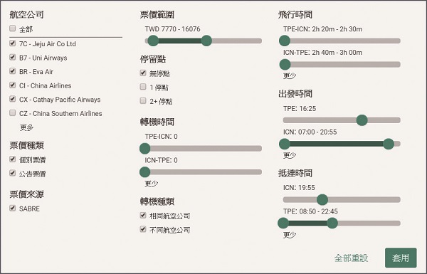 三、票價篩選班機選擇真豐富智能篩選助您知。可篩選航空公司、票價、轉機次數、轉機時間、航班飛行時間或出發和抵達時間過濾票價。