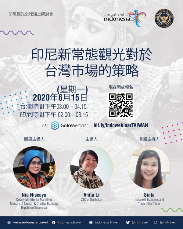 為了在新冠狀病毒疫情期間和康復期後的印尼觀光做預備並維持對國際旅客的好口碑,印尼觀光及創意經濟部╱觀光及創意經濟局將為主打國際旅客的觀光業者舉辦一場「印尼新常態觀光對於台灣市場的行銷方式」線上講習會,台灣為其中之一場。在此邀請您且盼望能透過Go To Webinar平台踴躍參加這次講習會。