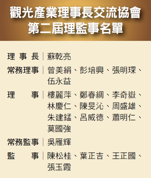 觀光產業理事長交流協會是觀光產業最具代表性的協會之一,凝聚了產業相關協會最重要的人物,積極對外行銷台灣、推廣台灣能見度。協會在9╱30舉辦第二屆會員大會暨理監事、理事長選舉,最後由全數參與會員高票選出蘇乾亮續任理事長。觀光產業理事長交流協會理事長蘇乾亮表示,面對新冠肺炎疫情的考驗之下,業界就應更緊密合作,為觀光業的新變革及新挑戰共同努力,一起對抗疫情。原本考量身體健康狀況,想將協會委以重任給其他重要幹部,但在女兒、會員的支持之下,再次挺身而出,繼續為會員服務,更感謝會員的支持,讓他能夠為產業盡一份心力,永續發展觀光產業理事長交流協會。