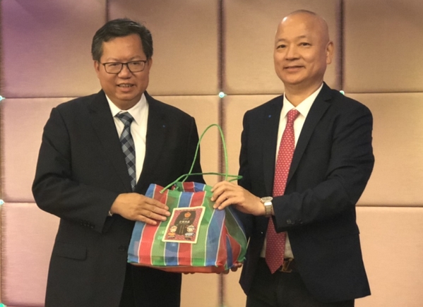 ▲桃園市長鄭文燦(左)與高雄市觀光協會理事長劉坤福互贈感謝禮。
