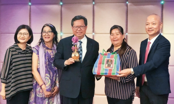 ▲高雄市觀光協會理事長劉坤福贈桃園市長鄭文燦高雄伴手禮。(左起)高雄市政府觀光局副局長葉欣雅、青蘭黏土藝術設計坊設計講師宋冠宜、桃園市市長鄭文燦、志斌食品股份有限公司董事長黃小鳳、高雄市觀光協會理事長劉坤福。
