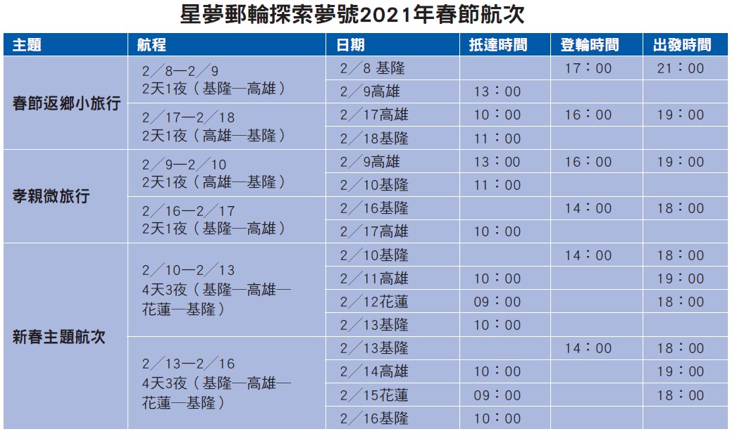星夢郵輪「探索夢號」從2020年7月在台復航起,先後啟動郵輪跳島、環島航程,恢復營運將近半年,深獲廣大旅客好評迴響。為了配合交通部 春節疏運政策,並持續提供旅客「類出國」旅遊方式,星夢郵輪於2021年春節期間,規劃2天1夜「春節返鄉小旅 行」、「孝親微旅行」,將藍色公路化為交通新選擇;並推出分別於小年夜與初二出發的4天3夜「新春主題航次」, 透過年貨大街、春聯教學等一系列精彩活動,體驗最難忘的海上新年!