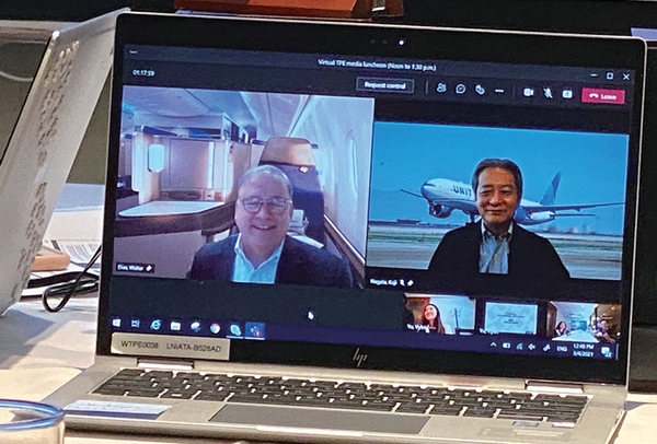 ▲(左起)聯合航空大中華及韓國銷售董事總經理戴亞斯(Walter Dias)、聯合航空亞太區傳訊總監永田浩二(Koji Nagata),也在線上與台灣媒體交流分享最新資訊。