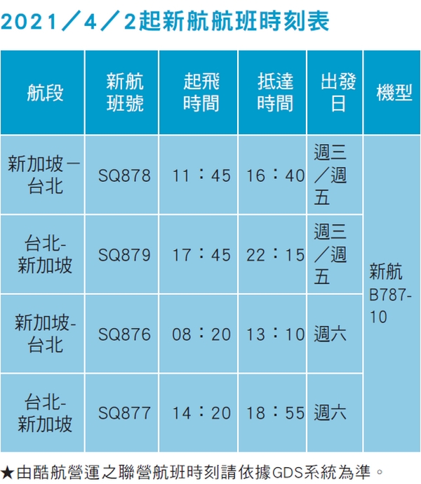 新加坡航空將於4月開始恢復1週3班往返新加坡與台北之間的飛航服務,搭配1週7班由酷航營運之聯營航班,每週共計有10班飛行新加坡台北來回航線,提供旅客更多的航班選擇。