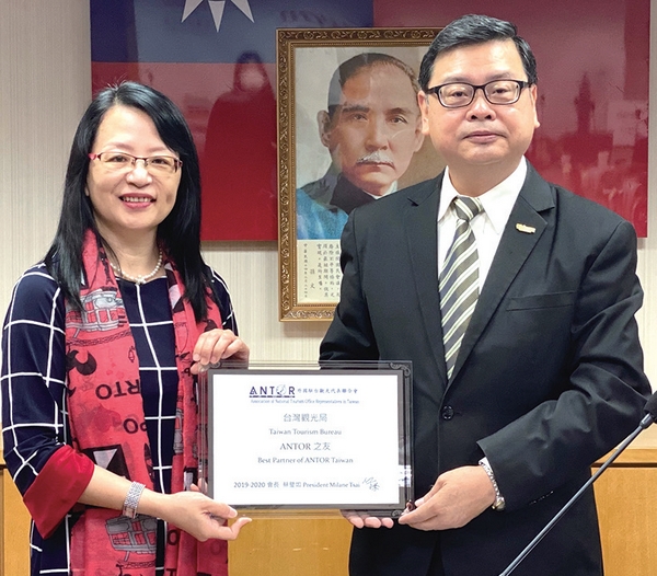 ▲(左起)外國駐台觀光代表聯合會會長翁淑惠,致贈ANTOR之友給予觀光局局長張錫聰。
