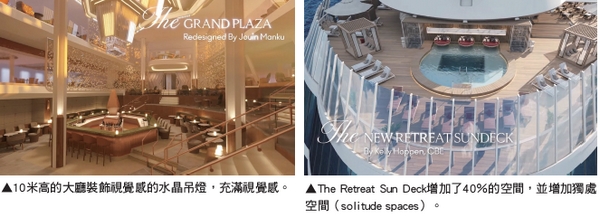 遊輪大廳(Grand Plaza)也是由Sanjit Manku所設計,他增加了10米的高度讓視野更加遼闊之外,還能提升通風,並裝飾視覺感十足的水晶吊燈,以及擴大了指標性的馬丁尼酒吧(Martini Bar),讓舞池可以容納更多客人盡情熱舞。