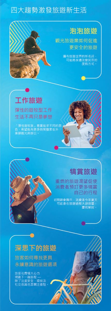 1.泡泡旅遊:觀光旅遊業如何促 進更安全的旅遊、2.工作旅遊: 彈性的遊牧型工作生活不再只是 夢想、3.犒賞旅遊:重燃的旅遊 渴望促使消費者預訂更多犒賞自 己的行程、4.深思下的旅遊:旅 客如何尋找更具永續意識的旅遊 選項。