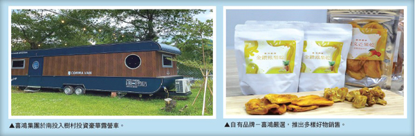 三級警戒以來,喜鴻假期的旅遊收 入頓時歸零,但早在去年7月,喜鴻假 期就開始積極準備轉型,長期抗戰新冠 疫情帶來的衝擊,除了籌備電商平台, 上架多樣商品,讓銷售額從初期的200 萬,到現在持續有400~500萬的營收, 更期待不斷突破。此外,喜鴻投資在半 年前開始與鴻達保經洽談合作、喜鴻育 樂積極開發露營車及露營地,提供奢華 新奇的住宿體驗,以及即將在9月開幕 「咖啡.候機室」咖啡廳,讓喜鴻多角 化經營。