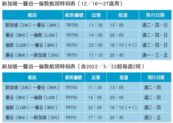 酷航倫敦航線將從12╱16開航,並自2022╱3起,提供每 週3班服務。班機將自新加坡出發,經停曼谷直達英國倫 敦。此航班由酷航的波音787夢幻客機執飛,此航班提供經濟艙 和酷航Plus豪華經濟艙服務。酷航目前的廣體客機機隊由20架波 音787夢幻客機所組成,此機型能高效率的運營長途航班,並提 供卓越的運營經濟性和環境效益。