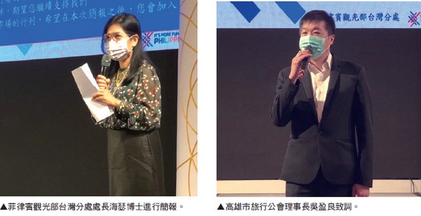 菲律賓觀光部台灣分處處長海瑟博士表示,非常感謝高雄市旅行公會理 事長吳盈良與團隊的幫助之下,可以舉 辦實體旅遊推廣說明會,雖然防疫的考 量下,卻仍有許多業者到場支持,讓菲 觀部非常的感動,也期盼在疫情趨緩之 前,提前做好準備、搶得先機,疫後能 帶領業者一起銷售菲律賓的產品,讓旅 遊市場再度回歸正軌。