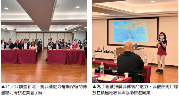 因此除了今年的全台15場推介會,菲律賓觀光部台灣分處 近日展開第2階段的全台說明會,包括10╱26、27、11/16分 別在台中、南投、高雄舉辦旅遊推廣說明會,也於12/14前 進新北,在新北市旅行公會的協助下,邀請新北的旅遊業者熱 情參與,菲觀部也將菲國魅力毫無保留的傳遞給北灣旅遊業者 了解。值得一提的是,近期菲觀部也將前進更多縣市與業者會 面,期盼讓更多旅遊同業了解菲律賓的特色與亮點。