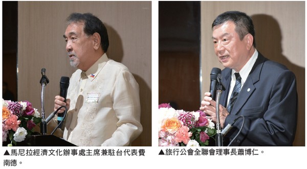 ▲(左起)旅行公會全聯會理事長蕭博仁、阿曼王國駐華商務辦事處處長蘇利門·阿默蓋瑞、馬尼 拉經濟文化辦事處主席兼駐台代表費南德、外交部亞太司副司長周啟宇、菲律賓觀光部台灣分處處 長海瑟博士、馬尼拉經濟文化辦事處副代表賀喜德、交通部觀光局國際組組長黃勢芳、台北市政府 涉外事務副執行長益子翔、旅行業品質保障協會理事長許禓哲。