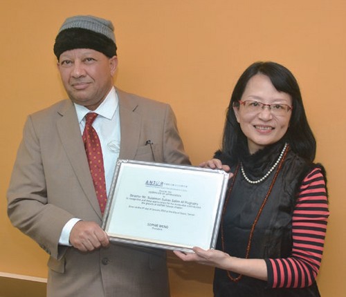 ▲(左起)阿曼王國駐華商務辦事處處長蘇利門.阿默蓋瑞處長(Mr. Sulaiman Sultan Al-Mughairy)、ANTOR外國駐台觀光代表聯合會會長翁淑惠,代表發發感謝狀。