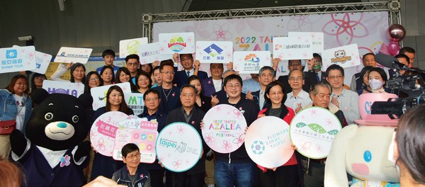 2022台北杜鵑花季3╱3於大 安森林公園舉辦記者會, 宣布為期一個月的台北杜鵑花季已自3 月起於大安森林公園、城南台大周邊正 式展開,並由台北市副市長蔡炳坤、 三麗鷗大耳狗喜拿及台北市人氣吉祥物 熊讚一同拉開杜鵑花苞裝置,揭開活動 序幕。今年台北杜鵑花季以「大耳狗喜 拿」為主角,在大安森林公園內打造 「杜鵑花」x「大耳狗喜拿」裝置,還 有結合城南周邊商圈特約店家推出「賞 花集點趣」抽獎活動,邀請民眾一起與 「大耳狗喜拿」來大安森林公園及城南 台大周邊賞花、抽大獎。