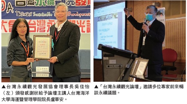 成立大會當天除選舉首屆理監事外, 更特別舉辦「台灣永續觀光論壇」,邀 請多位專家學者就永續議題對談,主談 人台灣海洋大學海運暨管理學院院長盧 華安闡述「永續觀光產業營運規劃與管 理」,永續觀念(SDGs與ESG)的緣起 與推展、SDGs與ESG的對應、同業與異 業的標竿案例、並拋出永續觀光作為的 構思。與談人銘傳大學觀光學院院長林 青蓉分享「永續觀光的多重樣貌~在光 譜間遊走與對話」,引導大家對於氣候 變遷對觀光產業的威脅?觀光活動對氣 候變遷的影響?等…相關議題的關注, 讓與會者受益良多。