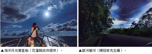 入秋後的9月及11月兩場以天文為 主題的「星光音樂會」與「星空郊饗 宴」,將分別在七星潭海岸與東大門夜 市盛大舉行,在特別規劃的透明星空帳 及草地上,享受星光、月光、音樂與花 蓮美食的交響樂章。除了活動之外,縣 府也舉辦一整年的天文解說員課程及認 證考核,培養在地天文解說人才。
