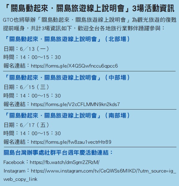 自去年取得台灣外交部核發之在台駐外機構證明函,成為 具有關島官方代表性的台灣辦事處,GTO積極在台推廣經貿投資、文化交流和觀光旅遊,同時也舉辦與參與多樣化的活動, 包括加入駐台美國各州政府辦事處協會與參與多場投資與貿易 說明會介紹關島投資環境,觸及100家以上科技公司、參與北 中南大型旅展活動吸引上千民眾造訪攤位、關島直飛航班包機 操作,以及旅行業者線上說明會,吸引北中南300家業者報名 線上參與。
