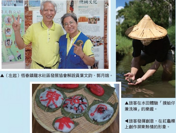 龍水社區地 勢平坦、水 源充沛,在 農業時代是 較富裕地 區,在台最 南的有機稻 田上,培育出有名的「琅嶠米」。隨著農業旅遊的興起,龍水社區發展多 樣特色遊程,例如稻作區的解說(插秧、收割),觀賞水鳥棲息地,或是 運用在地的優質稻米,教導旅客製作紅龜粿;只要揉好糯米團放入內餡, 在表面製作專屬造型,再運用粿印壓平印出龜印,等待20分鐘就能品嚐熱 呼呼的紅龜粿。解說員月娥姐還唱出了台灣民謠音樂家簡上仁教授造訪龍 水社區,所創作《琅嶠紅龜粿》,讓人感受滿滿的在地人情味。等待過程 中,旅客可以前往水田體驗「摸蛤仔兼洗褲」的樂趣,是都市旅客反璞歸 真、重回大自然懷抱的好選擇,更能在夏天沁涼的溪水中消消暑氣,好不 暢快。