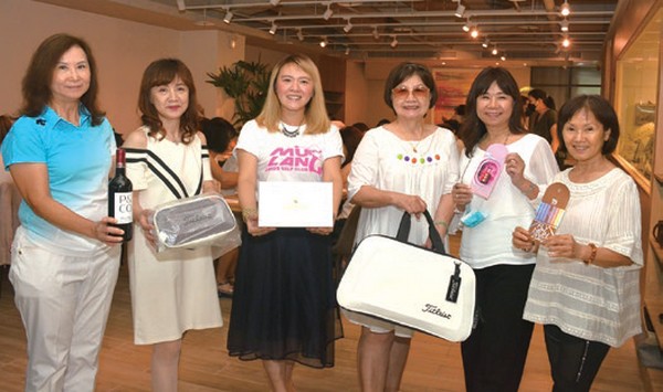 ▲木蘭隊例會頒發7月礁溪球敘中的總桿冠軍、淨桿冠軍、淨桿亞軍、淨桿季軍,以及由品冠旅遊所贊助的烏來麗緻璞石溫泉券。航旅業木蘭隊會長蔡璧如(左3)。