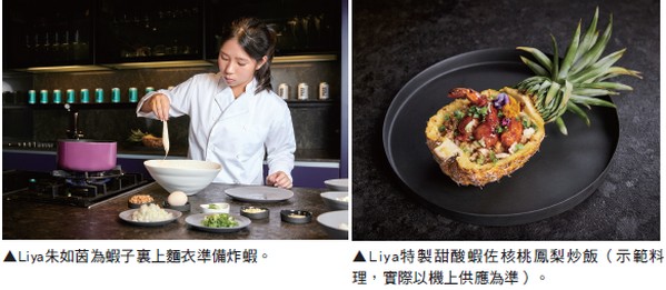 「Liya特製蜜汁腿排佐米粉」以沾烤 醬汁來回刷烤雞肉至外皮略帶焦香,再 搭配以醬油、蜂蜜、柚子汁等多種醬料 調製而成的醬醋米粉,就成為一道清 爽又充滿韻味的料理。「Liya特製甜酸 蝦佐核桃鳳梨 炒飯」則是把 去殼草蝦裹粉 油炸後,再淋 上特調甜酸醬 汁,並搭配鳳 梨炒飯品嚐, 保證是讓人忍 不住一口接一口的完美絕配。