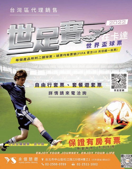 永信旅遊推出台灣區代理銷售球賽套 票行程,分為自由行及套餐遊兩種,入 住國際四星級連鎖飯店Holiday Villa Hotel & Residence Doha杜哈假日別墅飯店,飯 店內自助式餐點種類豐富,有適合華人 口味的粵式、馬來西亞及中日料理,不 用擔心與當地口味不符;交通方面則有 機場-飯店-球場點對點接送;還能免費 協助辦理看球賽必備的HAYYA卡。隨著 10月中旬0+7正式上路,旅遊市場旺盛 需求已開始醞釀,不論球票、住宿、餐 食及車導,永信旅遊都能一次幫您處理 好,輕鬆迎接商機。
