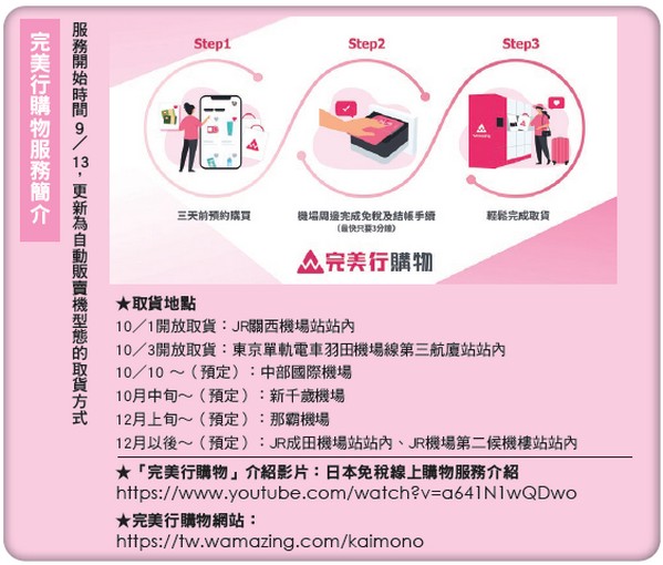 「完美行購物」在今年10月JR關西機場站站內正式開始。隨後,東京單軌電車羽田機場線第三航廈站站內、中部國際機場、新千歲機場、那霸機場、JR東日本成田機場站站內等地點也將開放取貨。之後開放取貨的地區也將逐漸擴大,讓到日本各地旅遊的旅客都能輕鬆購物、享受旅行。