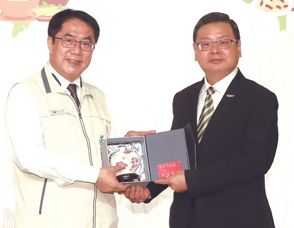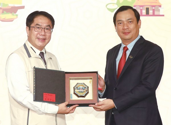 ▲台越代表交流晚宴,臺南市市長黃偉哲(左)致贈觀光局局長張錫聰紀念禮。