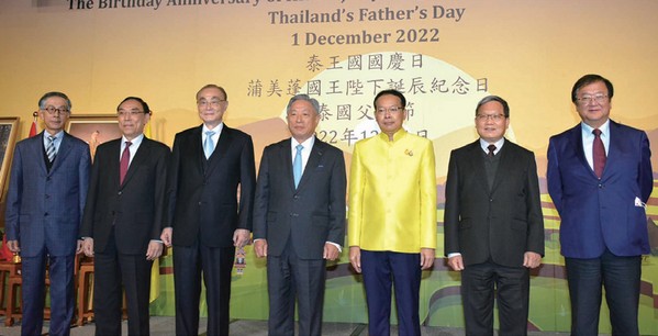 為了歡慶國慶、蒲美蓬國王但成紀念日,以及泰國父親節,泰國貿易經濟辦事處特別於12/1假文華東方酒店舉辦「泰王國國慶酒會」,包括退除役官兵輔導委員會主任委員馮世寬、外交部政務次長田中光、國民黨黨主席朱立倫等代表皆踴躍出席。泰國貿易經濟辦事處代表曾德榮致詞時表示,今年11/18、19非常榮幸受退輔會主委馮世寬邀請到訪台中市福壽山農場,其與泰國北部的皇家計畫基金會擁有長達50年的合作歷史,亦是台泰合作的基石。至今,泰國擁有超過5,000家台商公司、20萬名台商,而泰國也有眾多企業在台投資超過30年,皆為雙邊經濟的重要支柱。雖然疫情使得各國封鎖邊境,但隨著台灣10/13宣布開放後,泰國遊客也成為首批造訪的旅客,在在展現雙邊的深厚友情,也期許隨著後疫情時代的到來,雙邊持續緊密合作,重迎昔日榮景。