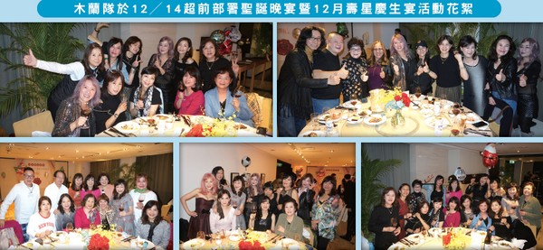 今年聖誕派對木蘭隊Bad Girls開心相聚,驚喜安排聖誕老公公、警察、流氓、雅痞、壞男孩⋯等來賓,一同參加木蘭專屬阿威老師包場演唱會,中西歌曲如癡如醉,會中歡慶12月壽星慶生,並由顧問王美美選出10位最佳造型獎,當天贊助單位則有航宇國際旅行社總經理龔姿安提供德國啤酒,白金花園酒店執行長林淑女提供XO醬禮盒,鼎運旅遊集團董事長陳怡璇提供品牌精美筆記本,另外會長蔡璧如也選購了加州黑皮諾紅酒,Pasta & Co.義大利米蘭國民甜點Panettone潘娜多妮聖誕麵包祝福木蘭姐妹聖誕快樂、新年快樂,繽紛精彩的節目讓木蘭隊主題派對氣氛嗨到最高點。