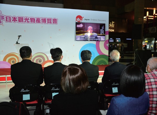 ▲疫情使日本觀光物產博覽會執行委員會委員長愛知和男以連線方式和台灣貴賓及民眾進行互動。