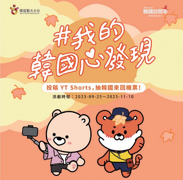 活動2則是「我的韓國心發現!韓國主題YT Shorts短片徵集」,由於近年來喜愛觀看短影音的族群大增,為鼓勵大家拍攝、分享與韓國有關的短影音,韓國觀光公社於即日起~11/10舉辦徵集活動,分為「韓國美食」、「韓國旅遊」、「韓國文化」3大主題,每個主題再區分成網紅組及素人組,台灣的朋友只要將對韓國的新發現、韓國的美、精彩的韓國旅遊瞬間等,拍攝剪輯成15~30秒的shorts短影片,並且上傳Youtube平台公開分享,主辦單位將決選出6名幸運兒,送出雙人韓國來回機票。
