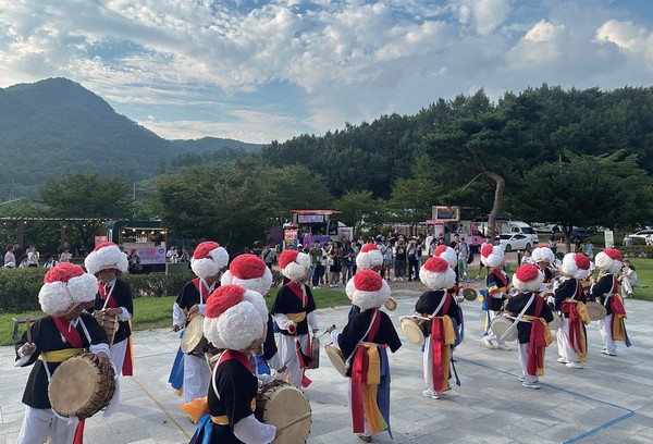 ▲完州大勝韓紙村,村民表演四物農樂歡迎旅客到來。