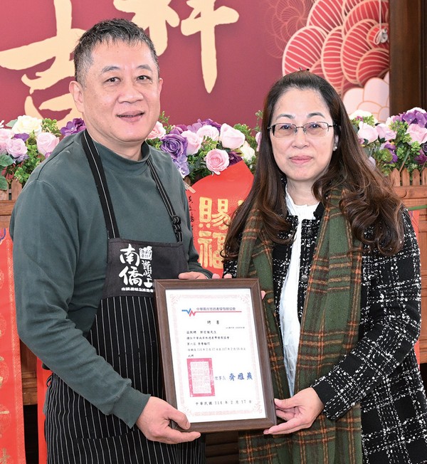 ▲中華兩岸旅遊產學發展協會理事長齊雁蘋(右)頒發顧問聘書給中華美食交流協會榮譽理事長郭宏徹(左)。