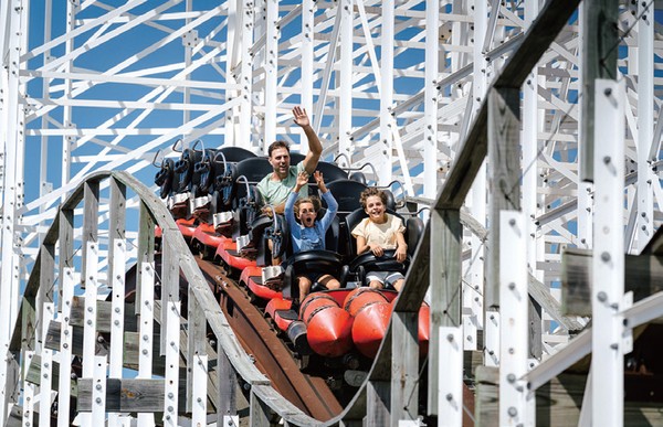 ▲佛羅里達州Fun Spot Kissimmee主題樂園搭乘「礦坑鼓風機」木製雲霄飛車。