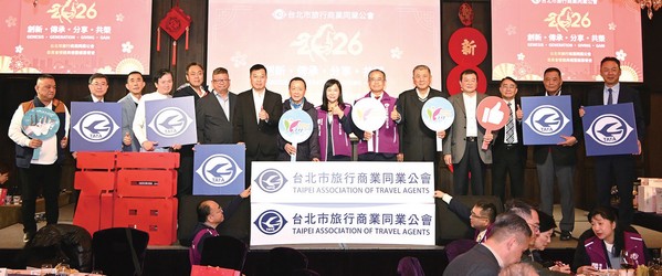▲(左起)三鼎旅行社董事長林攸浩、旅館旅行業國際行銷協會理事長徐銀樹、台北市旅行公會榮譽理事長吳志健、連江縣旅行公會理事長楊耀誌、台南市旅行公會理事長蔡承鴻、台中市旅行公會理事長馮國豐、旅行公會總會理事長吳盈良、台北市旅行公會榮譽理事長曾盛海、理事長陳怡璇、監事會召集人翁炳贊、榮譽理事長姚大光、台灣海峽兩岸旅行發展協會理事長蕭博仁、開喜旅行社董事長高成功、台灣國際郵輪協會理事長林博宗、台灣入境旅遊協會榮譽理事長王全玉。