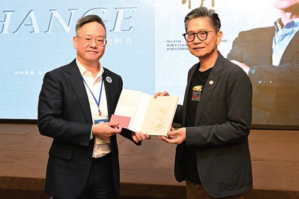 ▲雄獅集團董事總經理黃信川(右)分享旅遊企業如何快速擁抱AI等新科技,同時致贈持續稱霸新書排行榜的著作「叛逆,成就精彩」。