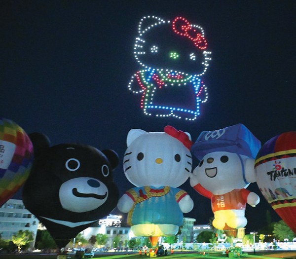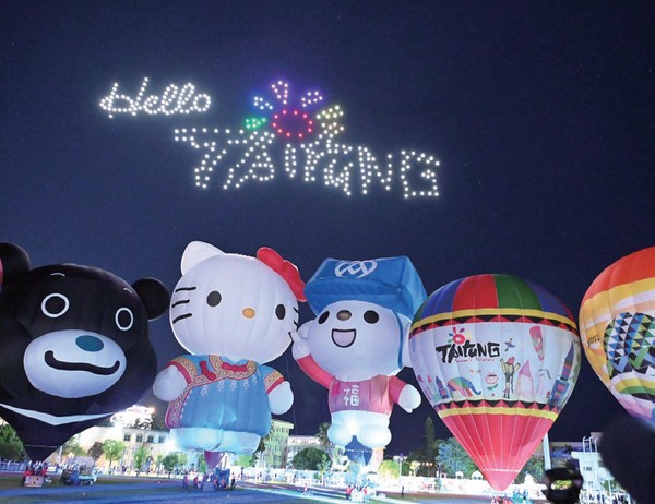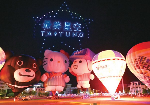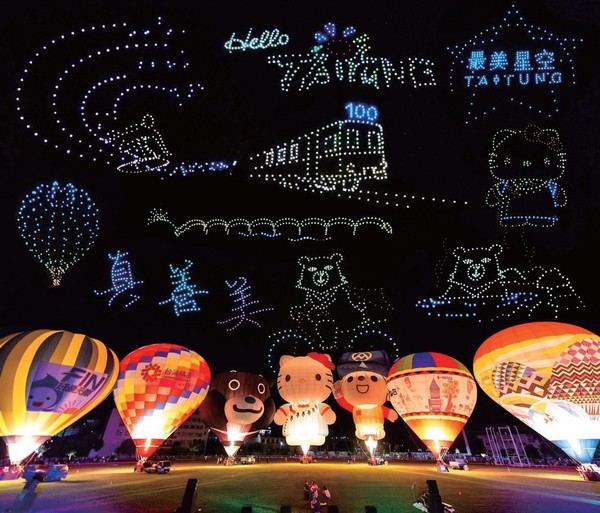 隨著音樂響起,300架無人機群從熱氣 球後方逐漸登場,在夜空排列出各種閃亮 圖樣。先以「Hello Taitung」作為開始,接著 陸續呈現出「Hello Kitty」、「金樽衝浪」、 「最美星空」、「乘風而騎」、「知本暖 湯」、「成功曙光」、「舊站百年」等代表 臺東意象的圖案,並以臺東品牌「真、善、 美」絢爛奪目收尾,現場觀眾滿滿感動,驚 呼「臺東真美!」