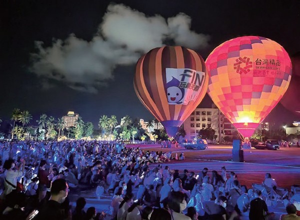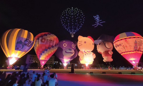 「2022臺灣國際熱氣球嘉年 華」光雕音樂會今年強 勢回歸,每場吸引逾萬人潮,話題性最高 的市區場,8╱5晚間在臺東縣立體育場盛 大舉行,全臺首創的「熱氣球x無人機」 聯合展演也成為本次光雕音樂會的最大 亮點,臺東縣長饒慶鈴、副縣長王志輝與現場2萬民眾,共同參與浪漫精彩的夜 晚。饒慶鈴表示,熱氣球搭配無人機共演 不僅是臺東的第一次,更是全國第一次, 非常開心能與現場所有觀眾共同見證空域 展演的新可能。