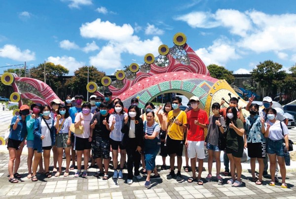 ▲雲林縣長張麗善(前排中)與雲林縣文化觀光處處長陳璧君(前排左8)與類畢旅的學生一同走訪口湖遊客中心。